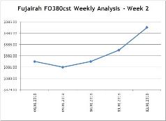 As per LiveBunkers.com, during last week (Week 2 2018), the bunker prices (FO380cst) at Fujairah were in the range of $380 to $385. The minimum value ($381.00) was on 09 Jan 2018 and the maximum value ($384.50) was on 12 Jan2018. The average value for the last week was $382.20.