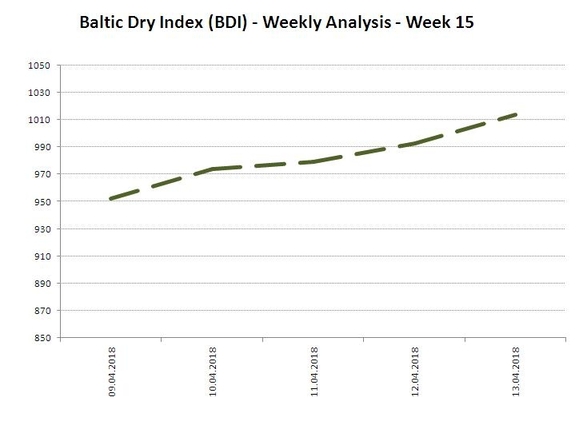 Baltic Dry Index (BDI) is the number published by Baltic Exchange, London on daily basis. On 18 Apr 2018 the Baltic Dry Index (BDI) was up 72 points (+6.41%) to a level 1124 as compared to the level (1052) on 17 Apr 2018. The average value of Baltic Dry Index for the last week was 982.40.