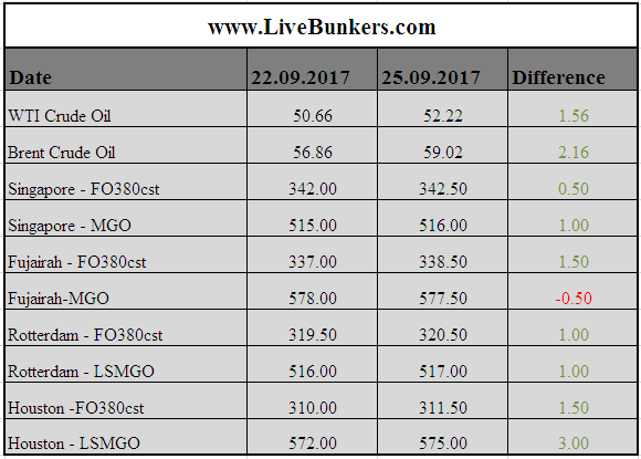 26SEP2017 - LiveBunkers.com - Previous Day Market Prices